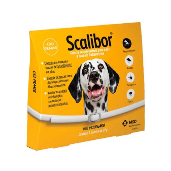 Coleira Antiparasitária Scalibor Cães GrandesA Coleira Scalibor é uma solução indicada para auxiliar no controle de infestações de pulgas carrapatos e outros parasitas seu uso é exclusivo para cães de grande porte. Com 65cm de diâmetro e peso de 25g ela é um acessório confortável que mantém o seu animal de estimação protegido por até 4 meses.Para que serve a coleira antipulgas Scalibor?A coleira antiparasitária Scalibor conta com a Deltametrina como princípio ativo. Ao ser fixada no corpo do animal a coleira de 65cm libera essa substância no organismo do animal que será responsável por controlar infestação de pulgas carrapatos moscas e mosquitos que tiverem contato com a pele do cão.Como usar a coleira para leishmaniose?Para usar da forma correta a coleira contra leishmaniose é importante ficar atento para algumas recomendações. Você deve deixar um espaço de cerca de 2 dedos entre o pescoço e a coleira evitando que o pet se machuque e a coleira mantenha sua eficiência.Outra dica é regular o tamanho da coleira enquanto você a coloca no animal sempre evitando que ela fique muito apertada. Você pode cortar a ponta que sobrar em mais ou menos 5 centímetros após a fivela.Durante o uso da coleira eventualmente é possível que o cachorro tenha alguma reação alérgica. Caso isso aconteça é necessário retirar a coleira até que os sinais de alergia desapareçam. Lembre-se de que em caso de qualquer dúvida você deve procurar um médico-veterinário de confiança.Cuidados necessários no uso da coleira Scalibor 65cmAo usar a coleira para leishmaniose Scalibor de 65 cm para proteger o seu animal de estimação contra os parasitas vetores da doença alguns cuidados são necessários. Entre eles:não usar coleira para leishmaniose em cães com menos de 3 meses.após manusear o produto lave as mãos com água e sabão.evite que o animal a mastigue a coleira.não precisa retirar a coleira para dar banho no animal.retire a poeira da coleira uma vez ao mês com pano úmido.Para mais informações sobre o uso correto da coleira antipulgas verifique a bula da Scalibor e procure orientação de um médico-veterinário especializado.Outras opções da coleira antipulgas ScaliborAlém da coleira antipulgas Scalibor exclusiva para uso em cães de grande porte no pet shop online da você encontra a coleira scalibor para cães pequenos e médios. Assimtodos os seus animais de estimação estarão protegidos contra pulgas carrapatos e outros agentes parasitários.Armazene corretamente a sua coleira antipulgas ScaliborPara conservar corretamente a sua coleira antipulgas Scalibor o laboratório MSD Saúde Animal recomenda: armazenar local fresco e seco ao abrigo da luz solar e fora do alcance das crianças.Coleira Scalibor com preço baixo é na !Se você precisa da Coleira Scalibor com preço baixo o lugar certo é o pet shop online da . Só aqui você tem à disposição toda a coleção de medicamentos para cães e produtos MSD Saúde Animal com condições acessíveis e sem precisar deixar o seu cão sozinho em casa. Incrível não é mesmo?