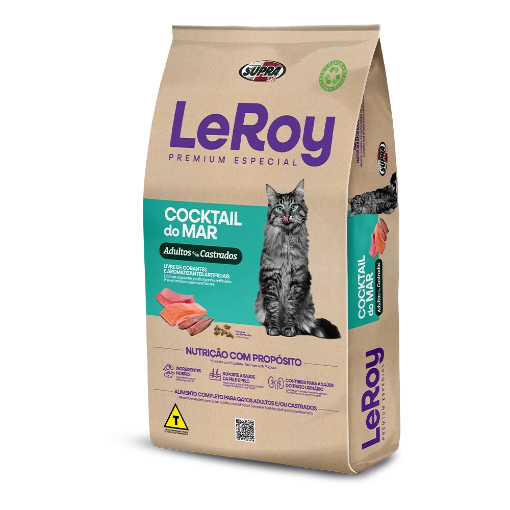 Farinha de Salmão (0.5%), Farinha de Peixes (15%), Hidrolisado de Fígado de Aves e Suíno, Arroz Integral, Milho Moído*, Farinha de Trigo, Farelo Proteico de Milho 60*, Farelo de Soja**, Grão de Linhaça, Polpa Desidratada de Beterraba, Levedura de Cervejaria Inativada Desidratada, Óleo de Aves, Óleo de Peixes, Cloreto de Sódio, L-Carnitina, L-Taurina, Extrato de Yucca, Bentonita, Vitaminas (Vitamina A, Vitamina C, Vitamina D3, Vitamina E, Vitamina K3, Vitamina B1, Vitamina B2, Niacina (Ácido Nicotínico), D-Pantotenato de Cálcio, Vitamina B6, Biotina, Ácido Fólico, Vitamina B12, Cloreto de Colina), Minerais (Sulfato de Cobre, Sulfato de Ferro, Iodato de Cálcio, Sulfato de Manganês, Selenito de Sódio, Óxido de Zinco, Cloreto de Potássio, Cobre Aminoácido Quelato, Proteinato de Selênio, Zinco Aminoácido Quelato), Bissulfato de Sódio (0.5%), BHA (Butilhidroxianisol), BHT (Butilhidroxitolueno), Propionato de Cálcio, Sorbato de Potássio, Aditivo Prebiótico (Parede Celular de Levedura (Mananoligossacarídeos)).Este produto não possui corantes artificiais em sua composição, estando sujeito a pequenas variações em sua coloração.