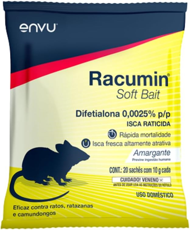 O Raticida Racumin Soft Bait é eficaz contra ratos e camundongos, indicado para controle de infestações em ambientes internos e externos.